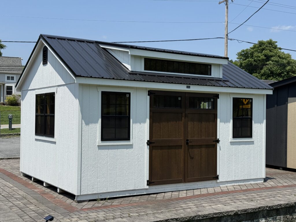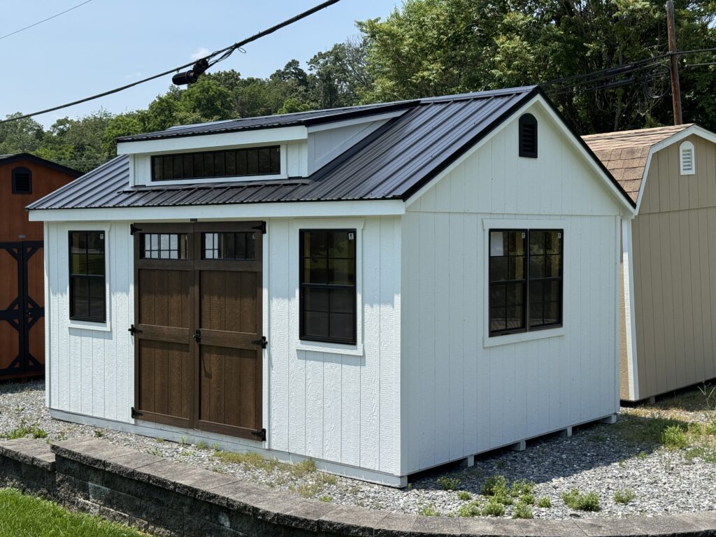 white shed shed with brown accent