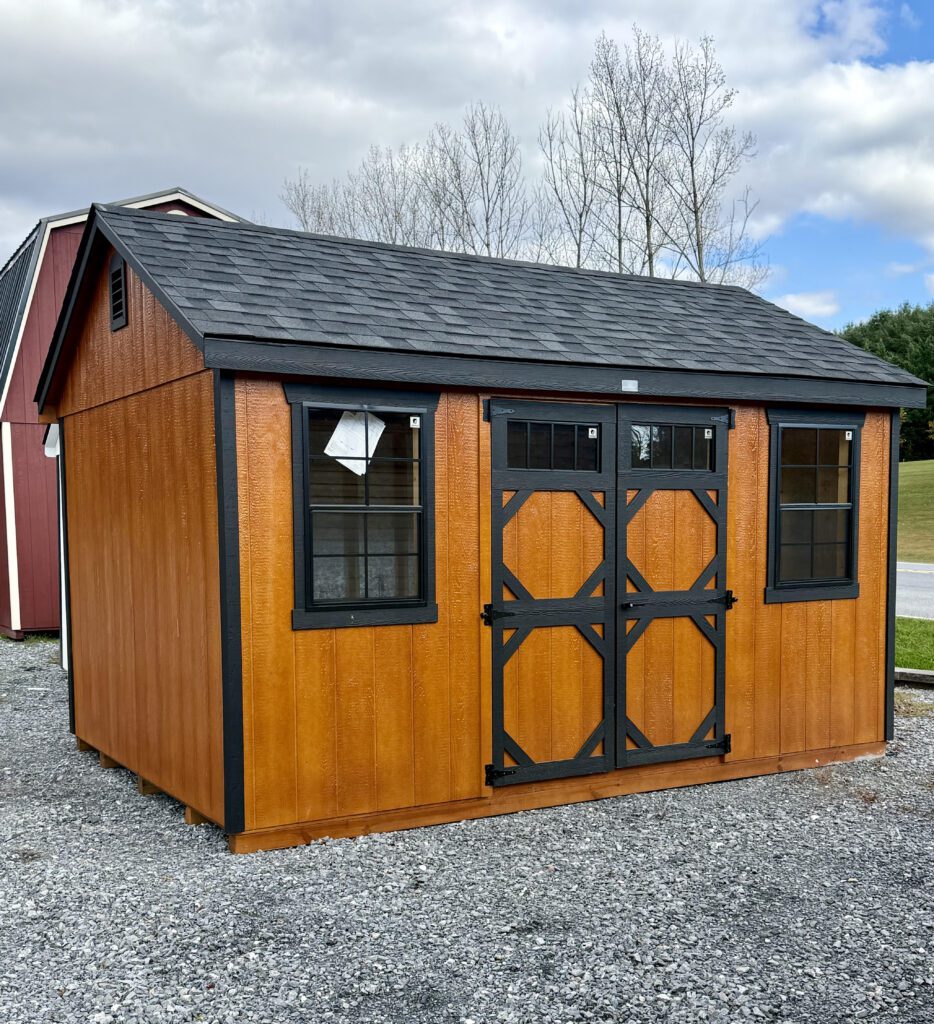This striking 10×14 shed features a beautiful cedar-stained exterior paired with bold black trim for a modern, high-contrast look. Built by skilled Amish craftsmen, it offers exceptional quality and durability. The double barn doors with transom windows provide both style and easy access, while the two side windows allow plenty of natural light inside. Perfect for lawn equipment, storage, or a backyard workshop — this shed combines functionality with timeless design to enhance any outdoor space.