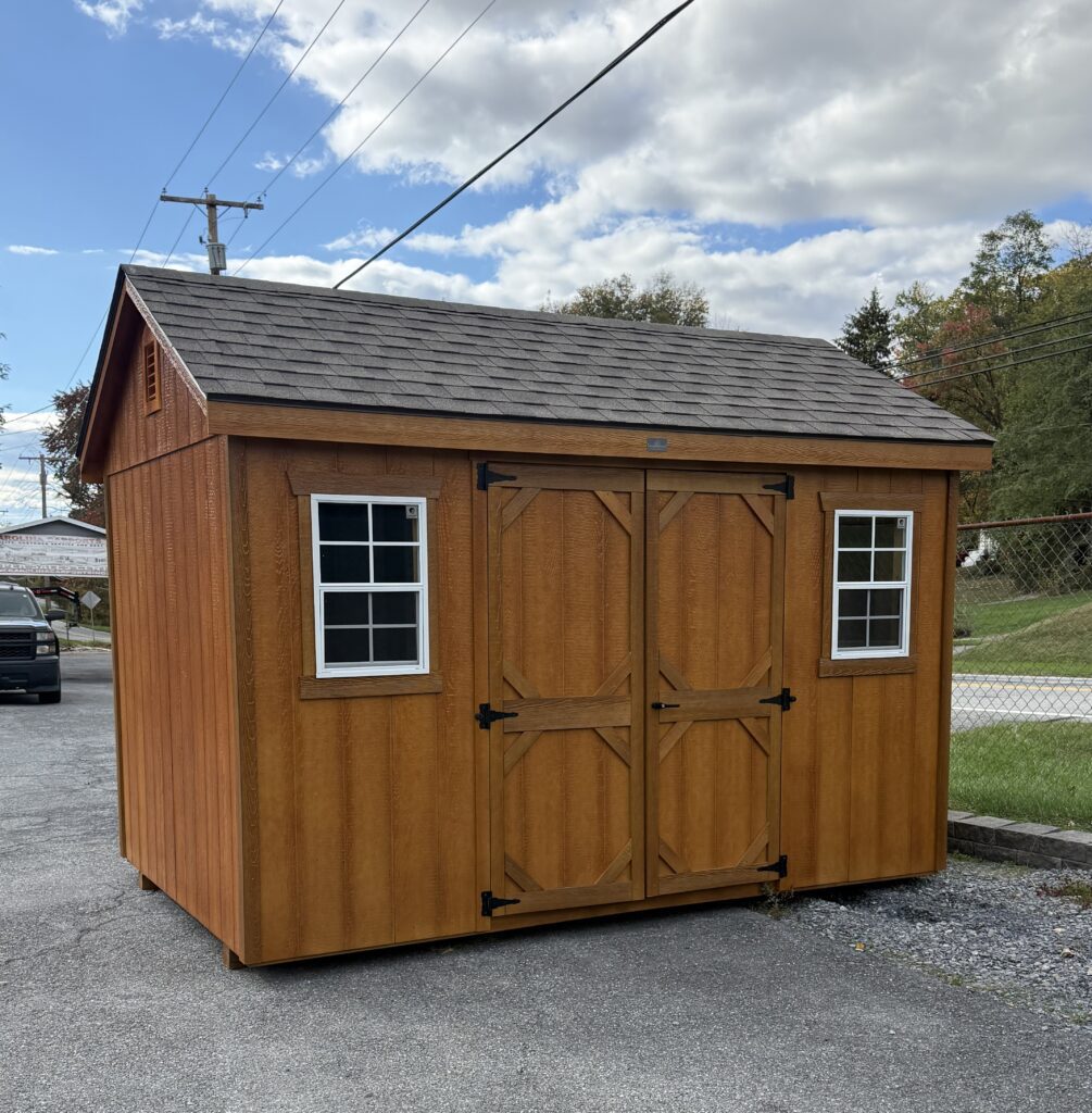 This handcrafted 8×12 shed combines Amish craftsmanship with timeless style and durability. Built from high-quality cedar-stained wood, it features double barn doors for easy access and two functional windows that bring in natural light. The architectural shingle roof ensures long-lasting protection from the elements, while the classic design blends seamlessly with any backyard. Perfect for storing tools, garden equipment, or transforming into a cozy workshop or hobby space.